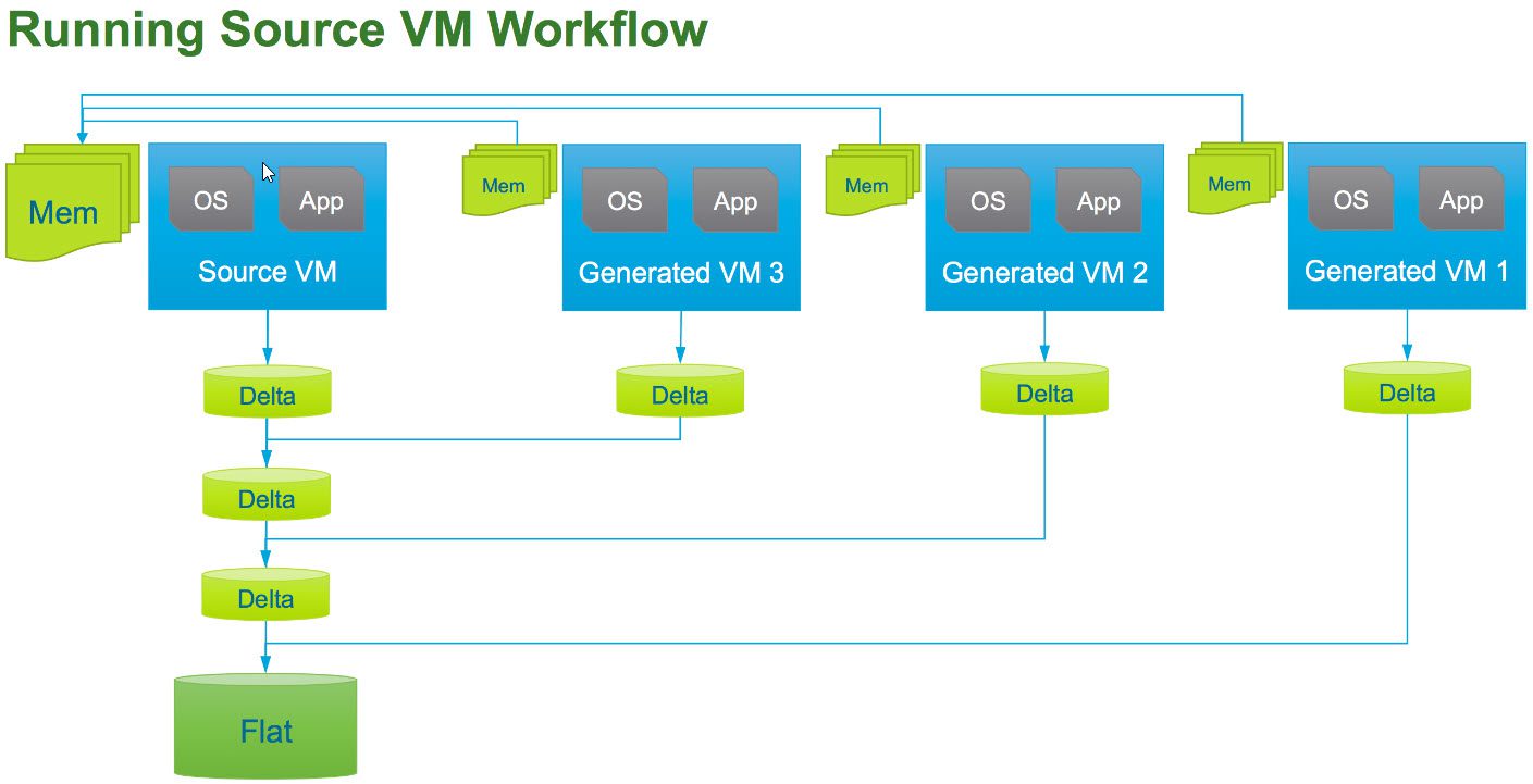 در این روش، VMware از قابلیت VMFork استفاده میکند. VMFork فرآیندی است که در آن یک ماشین مجازی در حال اجرا، بدون خاموش شدن، Clone میشود و ماشین جدید حافظه و دیسک پایه را به صورت اشتراکی استفاده میکند. این باعث میشود: